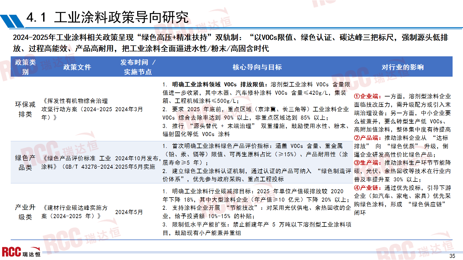 2024-2025年工业涂料相关政策呈现“绿色高压+精准搀扶”双轨制:“以VOCs限值、绿色认证、碳达峰三把标尺,